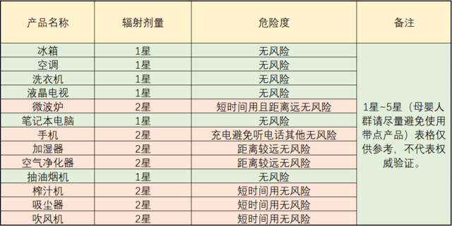 而非电离辐射包括紫外线、可见光、家电系列产品、手机电脑等,它们所产生的电磁场能量是非常低的,相对于CT、X光相差万倍,所以这些产品不足以对人的身体造成影响,当然尽量避免使用也是一种选择,不过我们生活的地球、乃至太阳、宇宙射线都存在着辐射能力,比如常听说的在太阳下暴晒会增加白血病几率的新闻,所以人是离不开辐射的,抛开剂量谈毒性确实是耍流氓行为,在比较微量的辐射环境下是不能对人造成伤害的,不要贩卖焦虑。下面我也汇总了一个与家电产品相关的辐射等级表格,大家参考着食用。